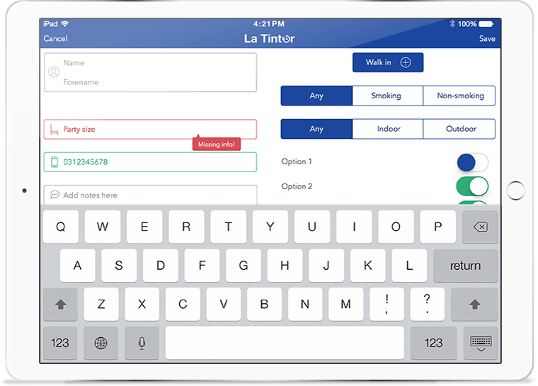 Empower your customers to move around and gain your confidence. Record name, phone number and party size and offer an automatic time estimate.